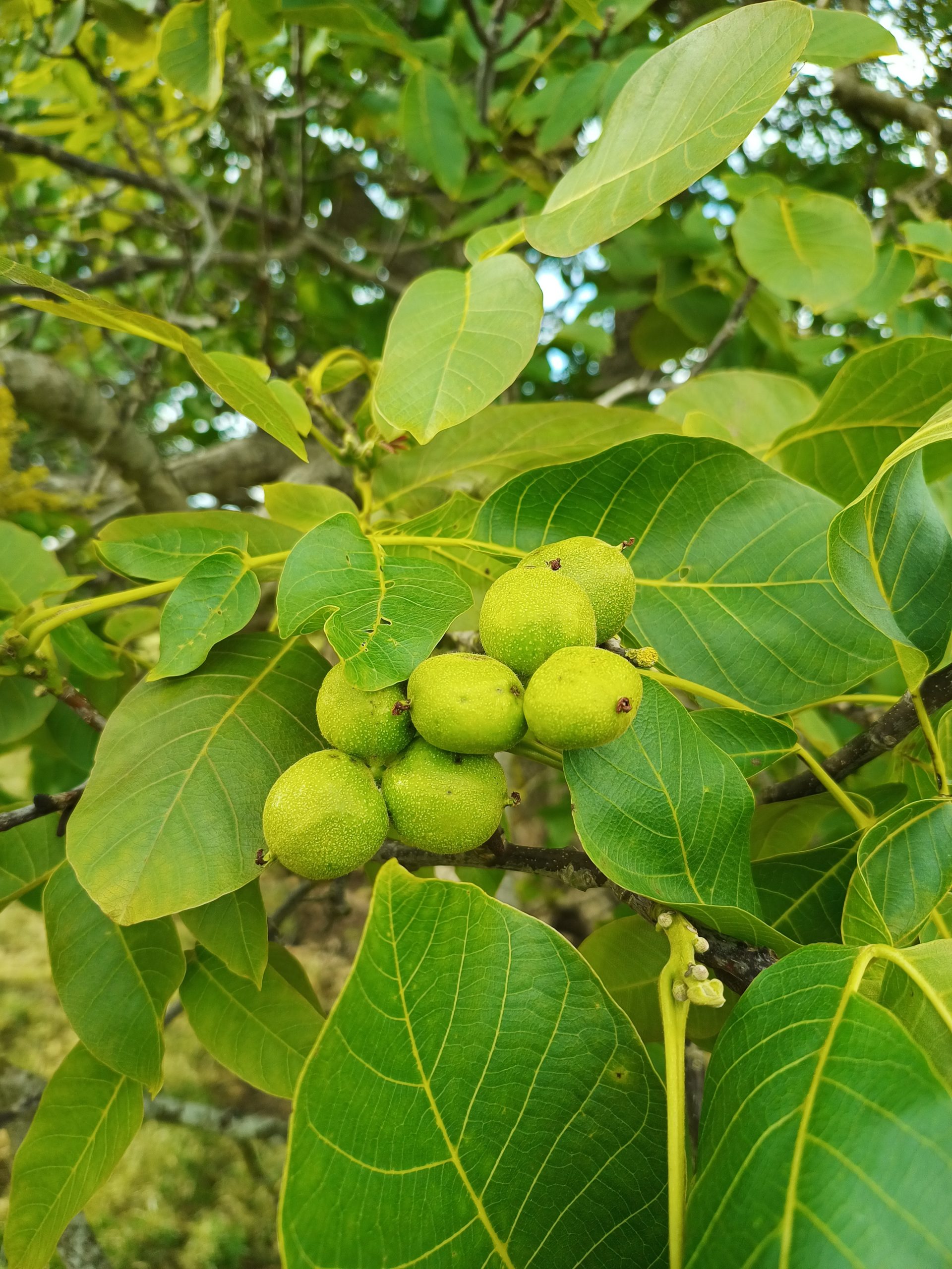 Old seedling tree, around 300m from the walnut orchard, you can see the cone of flowers which is very unusual and the resulting nut cluster, only a % of the flowers are like this but it does explain the characteristics of some of our seedling trees.